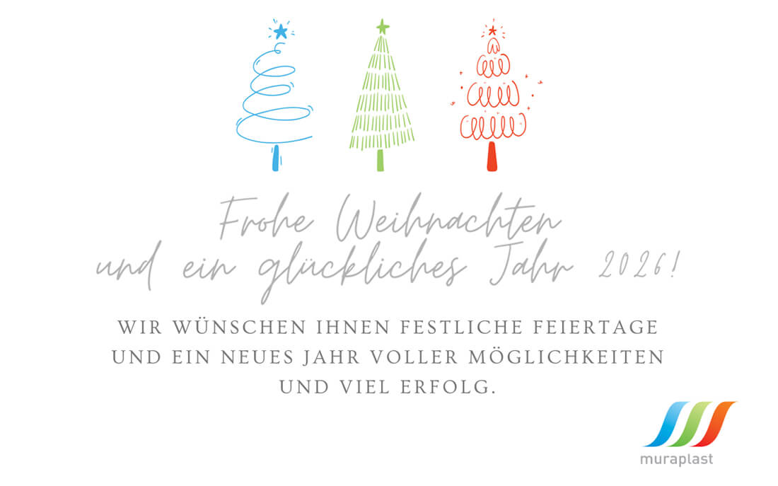 Bitte beachten Sie, dass Muraplast vom 23. Dezember 2025 bis einschließlich 6. Januar 2026 im Betriebsurlaub ist. Ab dem 7. Januar 2026 sind wir wieder wie gewohnt für Sie da.