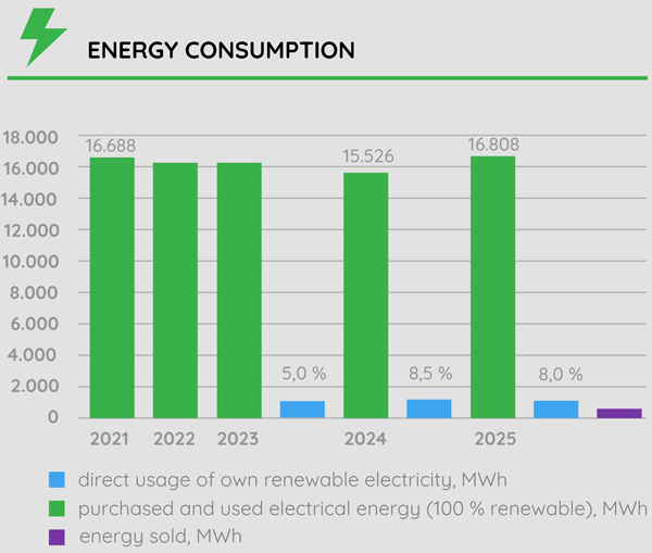 - 100% use of electricity from renewable energy sources