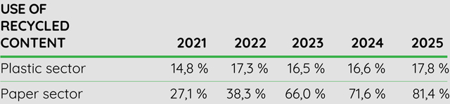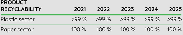 Target: 100% recyclability of paper and plastic products by 2025 - Use of recycled materials in products: